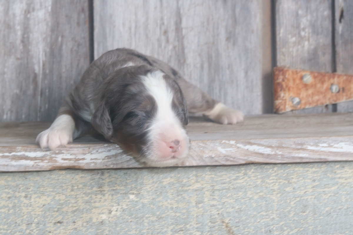 Rolly is a F1 Mini Bernedoodle male that is expected to mature at approximately 35-55 pounds and have a Heavy-Wavey Merle colored coat with tri colored markings.