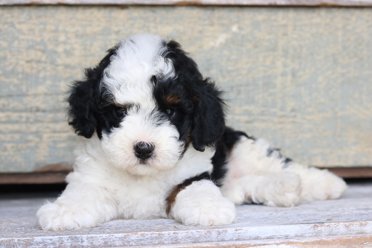 Rook is a F1B Micro Mini Bernedoodle male born to Luna and Lucky that is expected to mature to approximately 15-25 lbs and have a very heavy, wavy black-tri colored coat. Rook is weighing in at 2.4 pounds at 6 weeks old and has a medium temperament based off of his siblings.