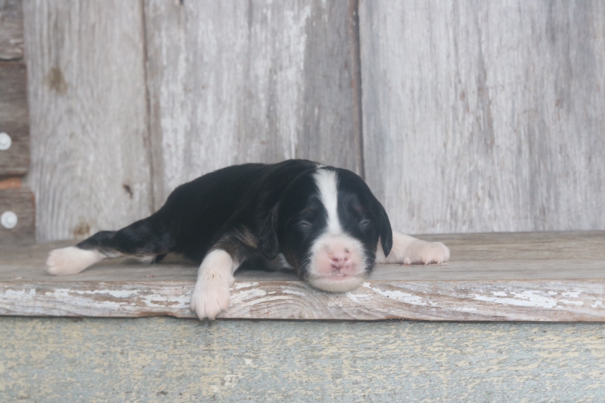 Rooster is a F1 Mini Bernedoodle male born to Phoebe and Bentley that is expected to mature at approximately 35-55 pounds and have a Heavy-Wavey Black Tri colored coat with traditional tri colored markings.
