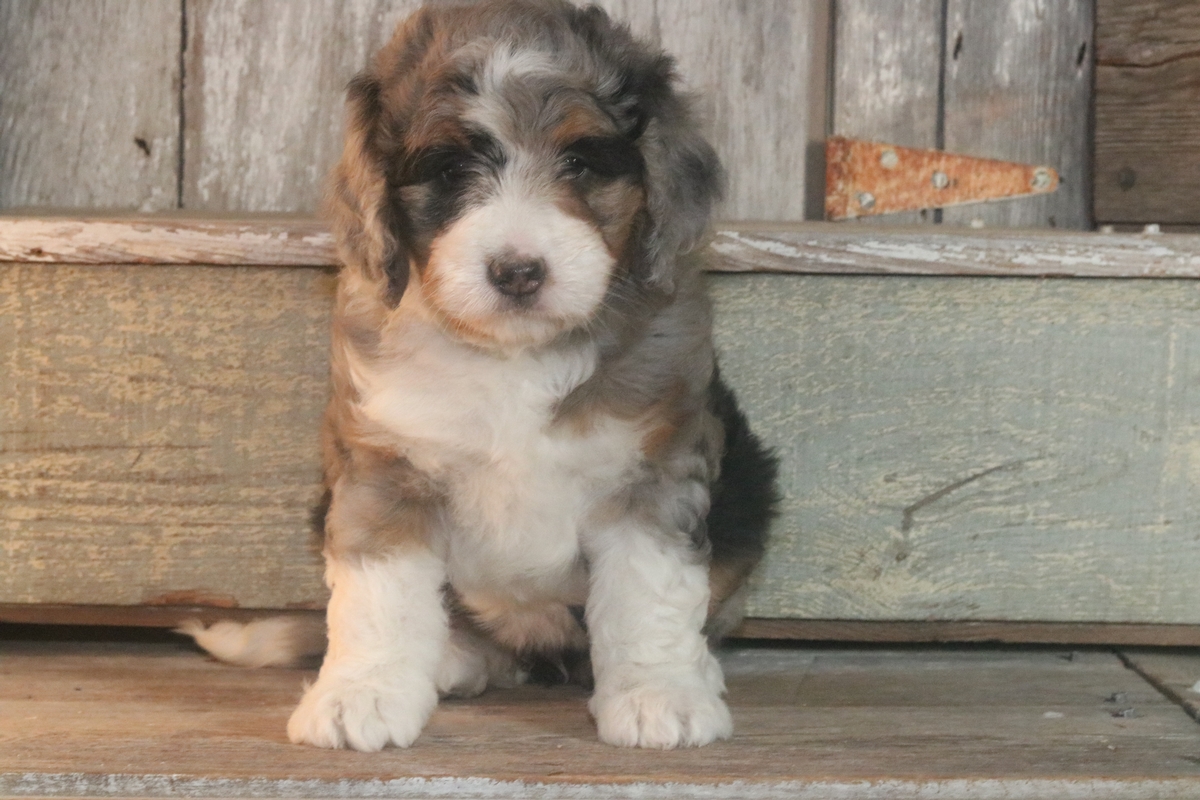 Rosalind was born on 6/26/2024 to Chanae and Teddy, she is a Merle female with Tri colored markings. She’s a Standard Bernedoodle female that is expected to mature at approximately 60-80 pounds (with the exception of a couple of puppies that could have the potential to exceed or stay under that size) and have a heavy/wavy coat. Rosalind is rated as having an outgoing temperament and weighs 8.8 pounds at 8/5/24.