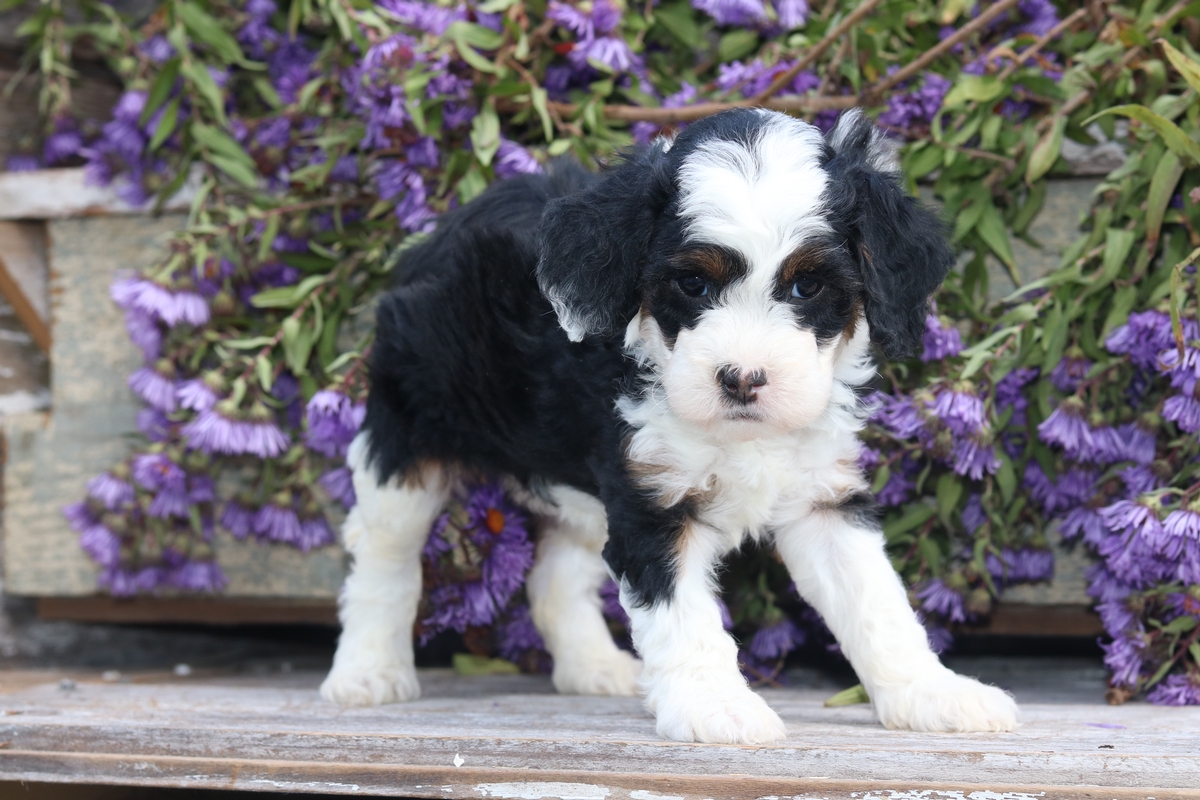 Twila is a F1B Tiny Bernedoodle female born to Sophie a Zues, this girl is estimated to mature around 20-30 pounds and is weighing in at 3.0 pounds at 6 weeks old and has a laidback temperament.