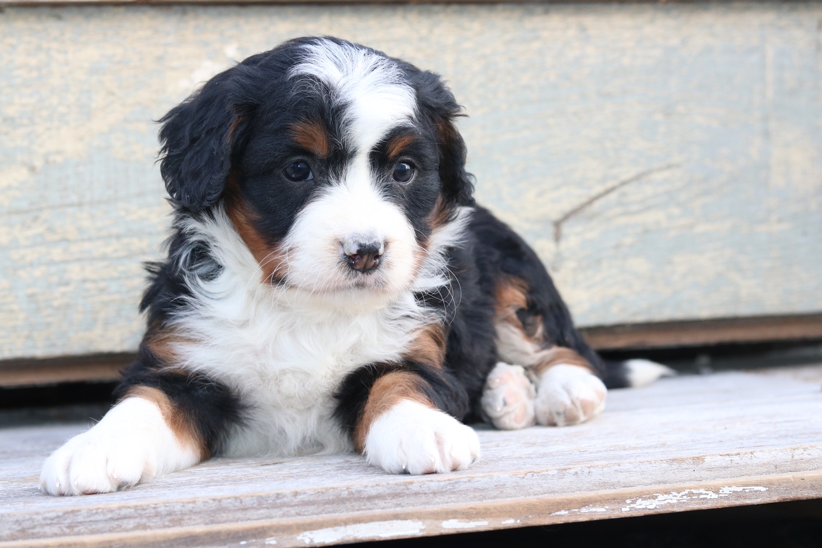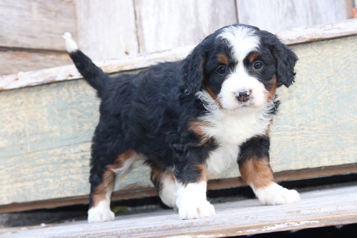 Ursel is A F1 Mini Bernedoodle girl that is expected to mature at appr. 25-45 lb and have a very Heavy, Wavey Black Tri color coat, she is weighing 4.6 pounds at 6 weeks old and is Rated as having an outgoing Temperament based off of her litter of 9 mini bernedoodle puppies.