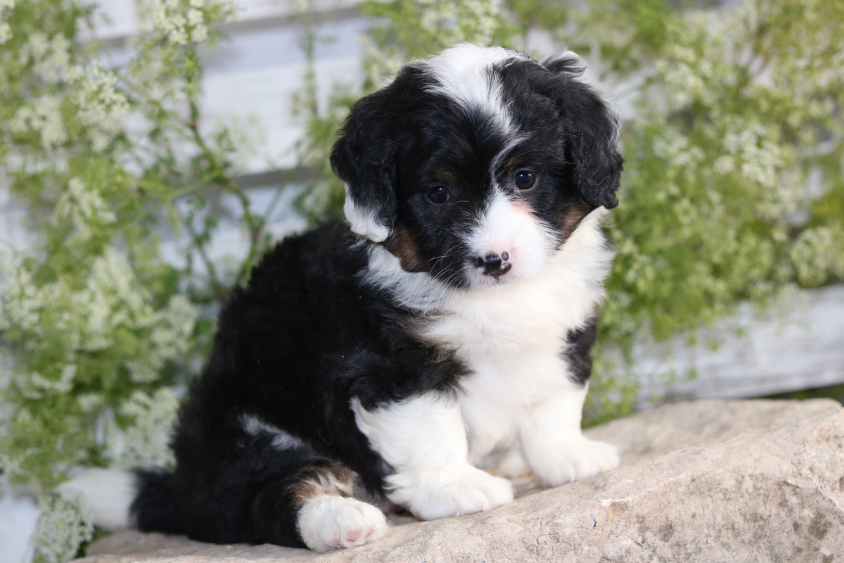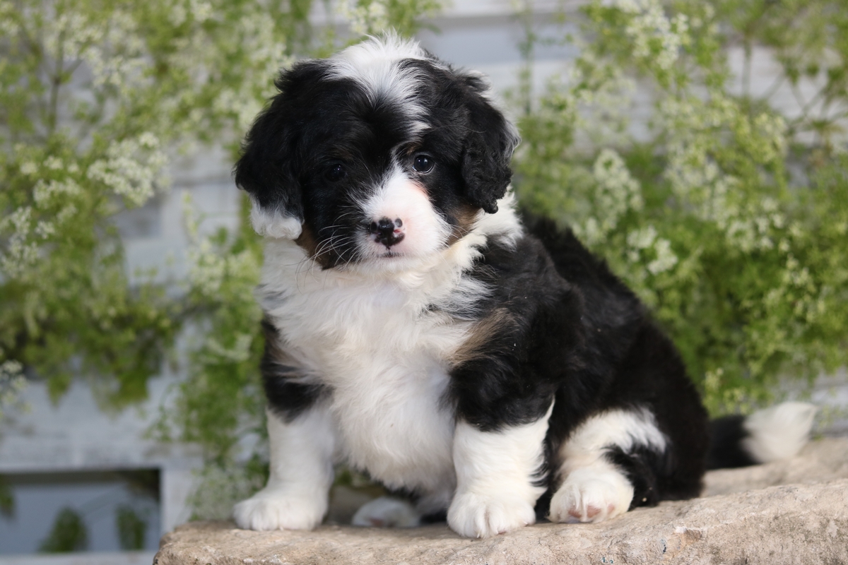 Vici is a F1 Mini Bernedoodle girl that is expected to mature to approx. 25-45 lb and have a very Heavy, Wavey Tri color coat, she is weighing in at 4.5 pounds at 6 weeks old and is also rated as a medium temperament in her litter of 5 mini Bernedoodle puppies. If you wish to reserve Vici, she can be reserved by making the NONREFUNDABLE deposit which will be a commitment for us to hold her until she is ready to go home by June 22nd or soon after.