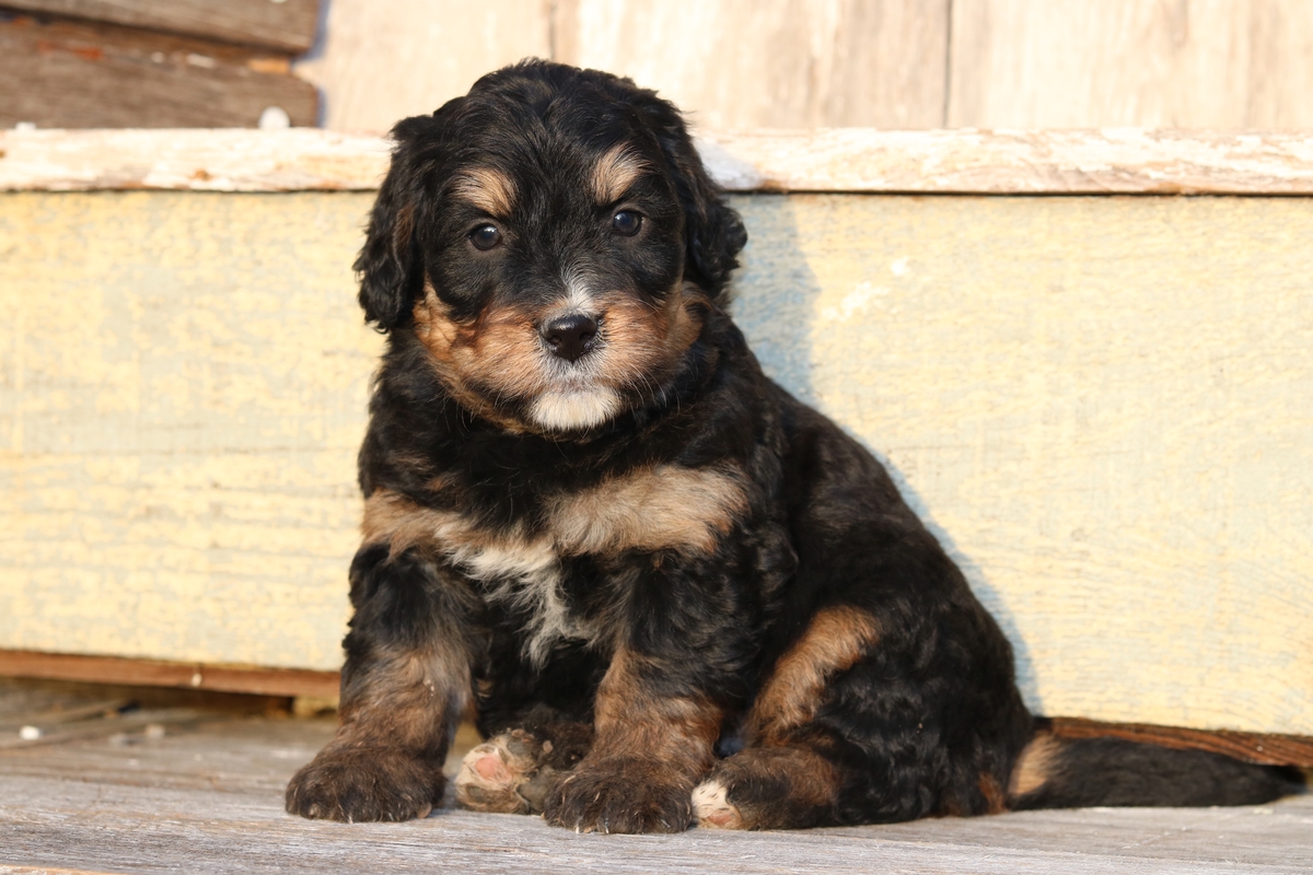 Waco is a F1 Mini Bernedoodle boy that is expected to mature to approximately 25-45 pounds and have a Wavey black tri color coat, he weighs 4.6 pounds at 6 weeks old and has a laidback disposition in his litter of 10 mini bernedoodle puppies.