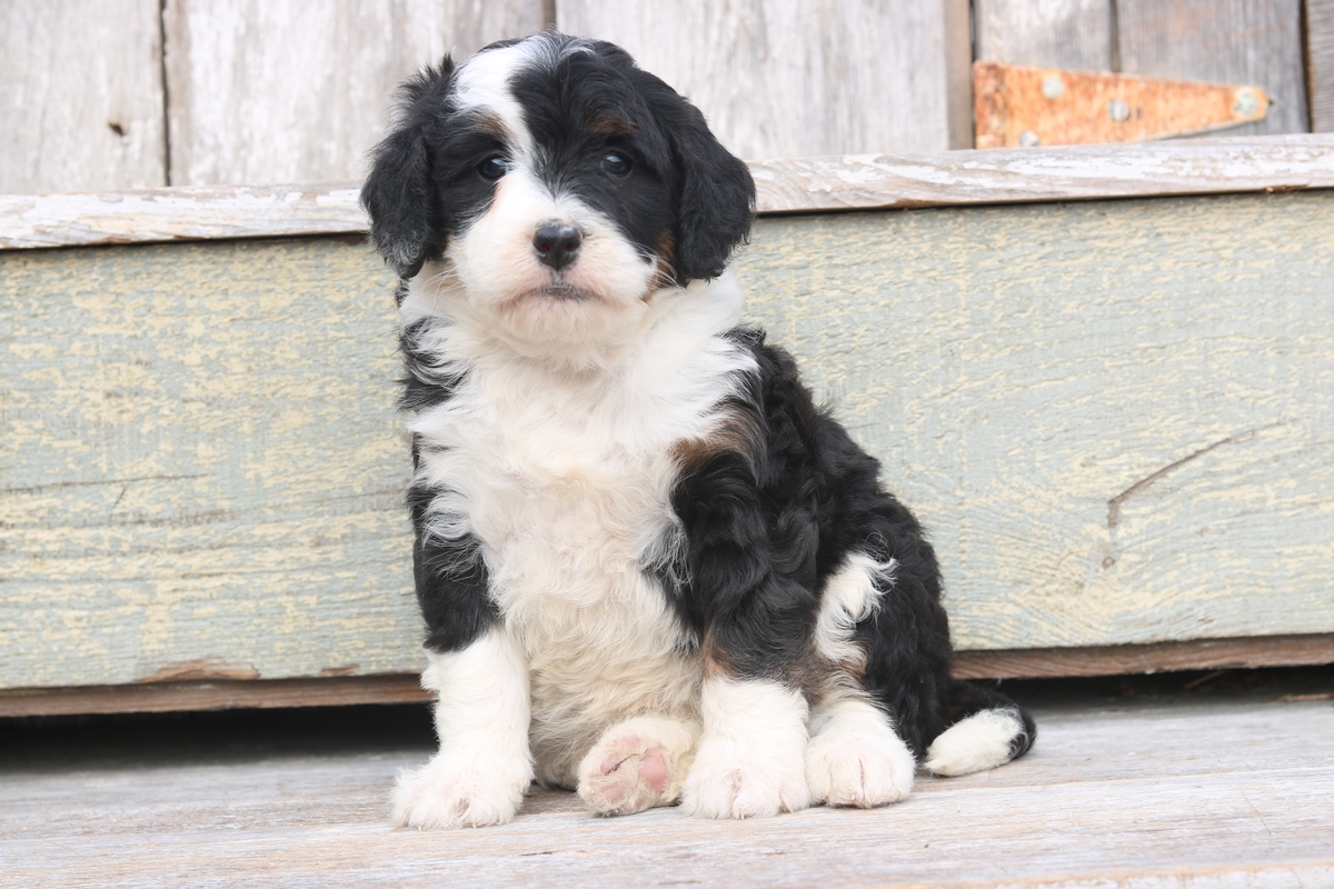 This gorgeous Bernedoodle girl is A F1 mini Bernedoodle, Traditional Black Tri in color, with a very nice, wavey coat, She does have a 2mm underbite which would be considered a slight underbite and should never be a health issue and she may even outgrow it, but she is discounted in price to reflect. Xulda is weighing 5.2 pounds as of 1/22/23 and is expected to mature at approxamintly 30-50 lbs. Xulda has a a underbite and is rated as having a medium temperament based of her.